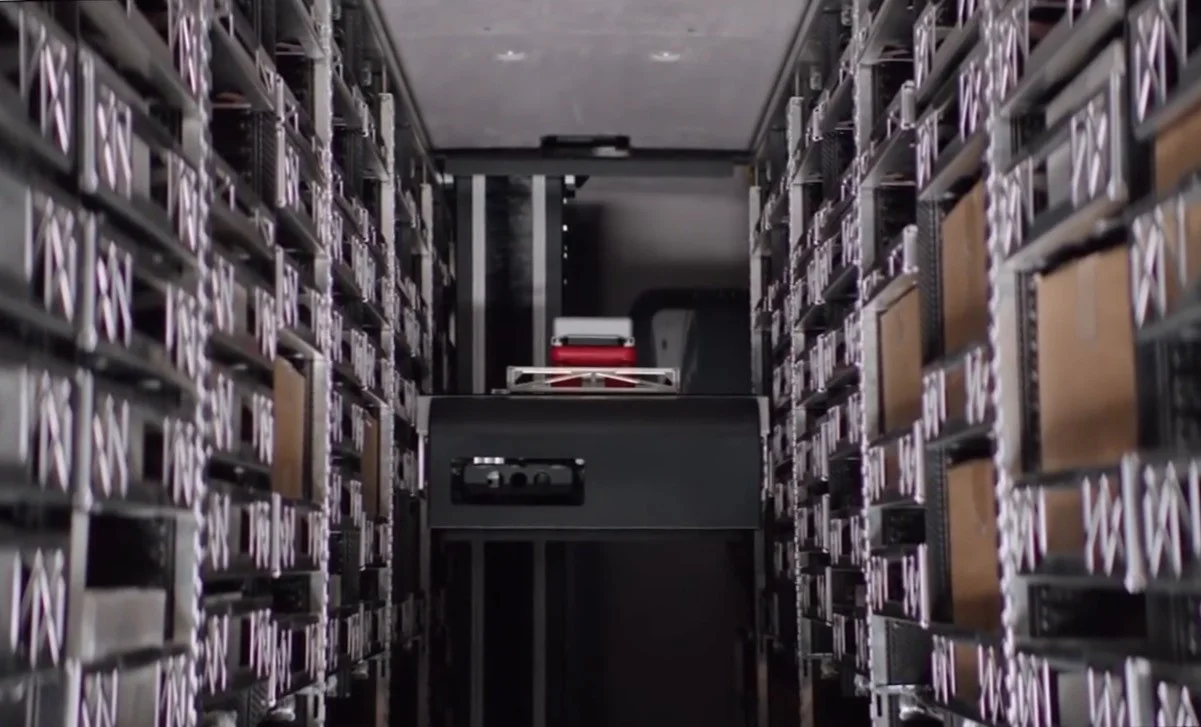 While the van is flashy on the outside, it is extremely functional on the inside and serves as a highly efficient automated mobile distribution center. All packages are loaded onto the truck by a driver-less loading vehicle:
