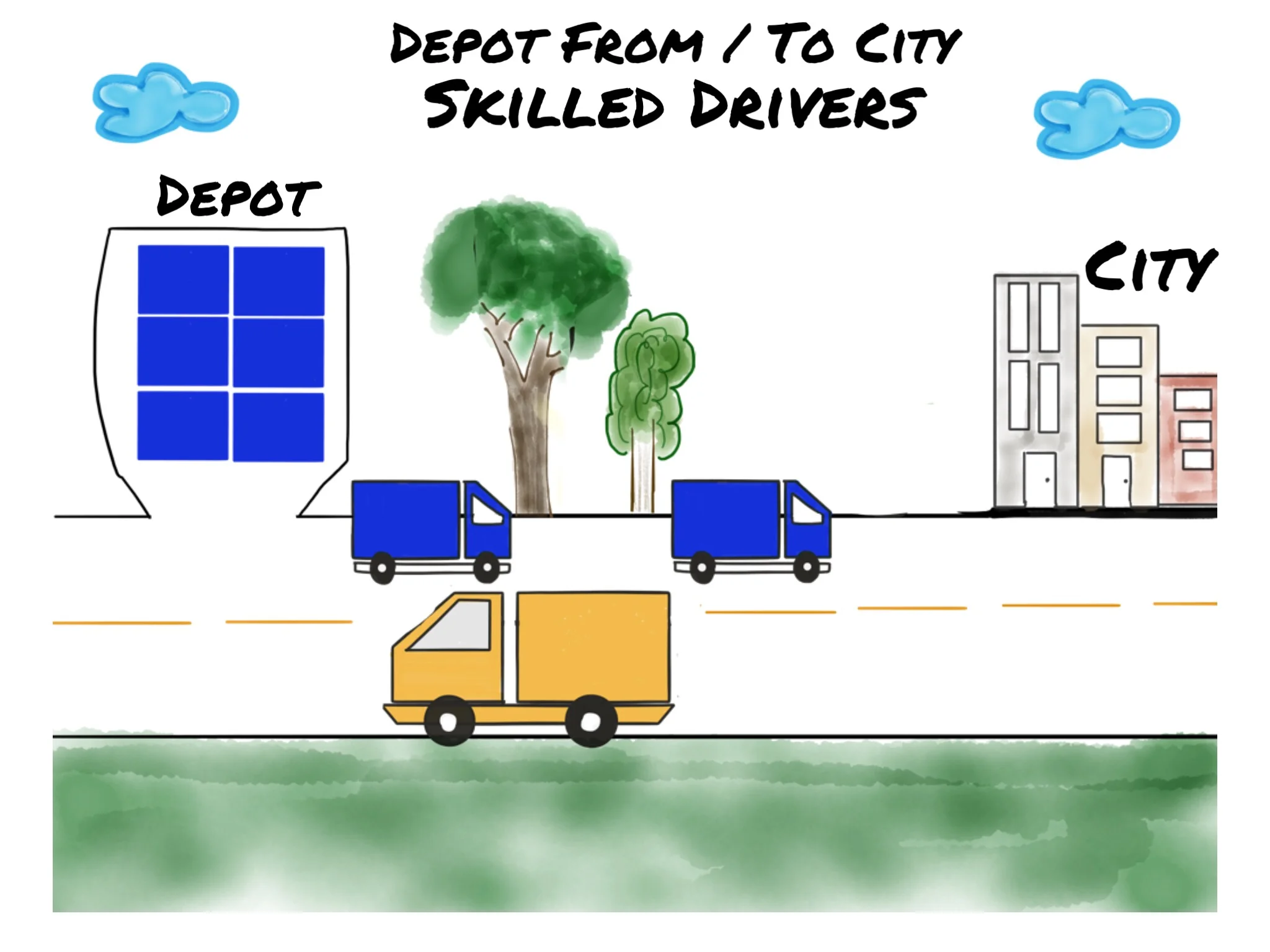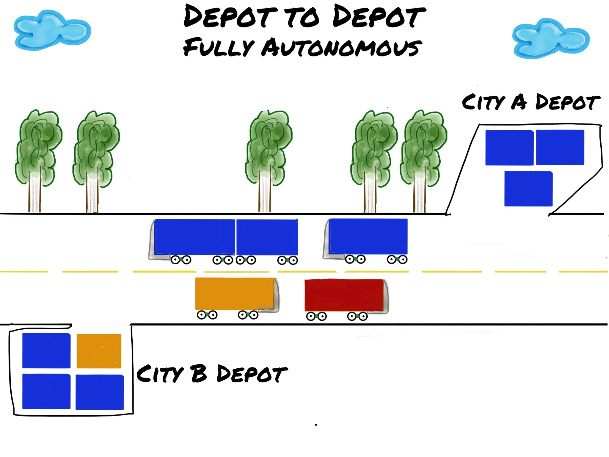 At the depot, the trailer would be loaded onto an autonomous vehicle. The autonomous vehicle would travel without a driver and drop off at the depot nearest the destination city for the load. From this depot, another driver would make the final delivery. Skilled drivers perform the difficult tasks of getting the truck to and from the depot locally, and the artificial intelligence does the easy highway driving between depots.